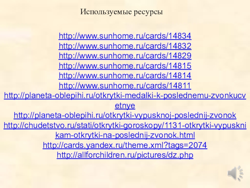 Используемые ресурсыhttp://www.sunhome.ru/cards/14834   http://www.sunhome.ru/cards/14832  http://www.sunhome.ru/cards/14829  http://www.sunhome.ru/cards/14815  http://www.sunhome.ru/cards/14814  http://www.sunhome.ru/cards/14811  http://planeta-oblepihi.ru/otkrytki-medalki-k-poslednemu-zvonkucvetnye http://planeta-oblepihi.ru/otkrytki-vypusknoj-poslednij-zvonok