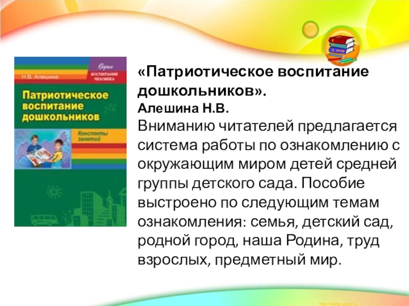 направленность и удобен в использовании, содержит планирование, конспекты занятий и развлечений по темам "Мой дом - моя семья", "Русская народная культура", "Столица нашей Родины - Москва!", "Земля - наш общий дом", "Защитники Отечества".