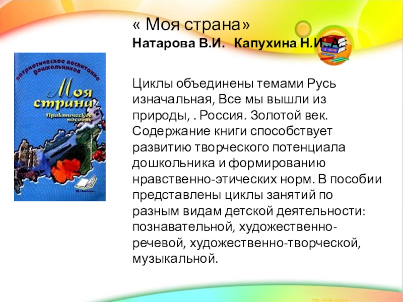 из возможных вариантов организации занятий с дошкольниками по ознакомлению с родной страной. Работа по данному пособию проводится совместно с книгой "Моя страна: Россия". В книге 30 бесед — примеров того, как можно построить эти занятия, сделав их интересными и увлекательными для детей. Наличие примерного сценария каждой беседы, методических рекомендаций, исторических комментариев значительно облегчат работу педагога.