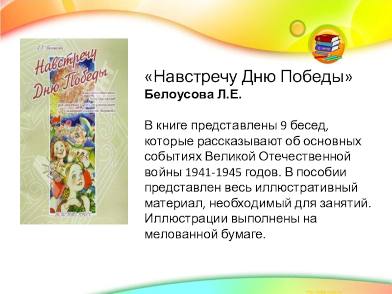 В книге представлены 9 бесед, которые рассказывают об основных событиях Великой Отечественной войны 1941-1945 годов. В пособии представлен весь иллюстративный материал, необходимый для занятий.