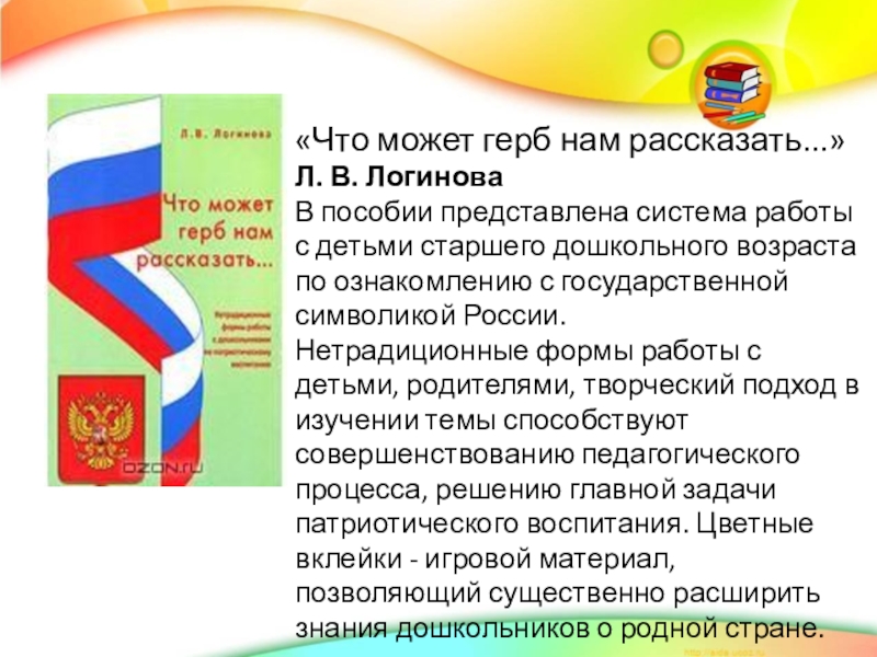 Нетрадиционные формы работы с детьми, родителями, творческий подход в изучении темы способствуют совершенствованию педагогического процесса, решению главной задачи патриотического воспитания. Цветные вклейки - игровой материал, позволяющий существенно расширить знания дошкольников о родной стране.