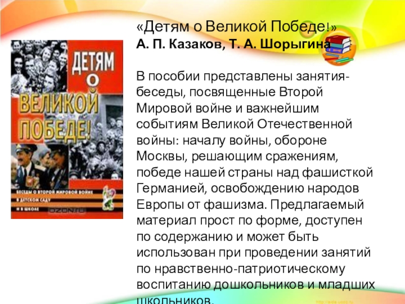 представлены занятия-беседы, посвященные Второй Мировой войне и важнейшим событиям Великой Отечественной войны: началу войны, обороне Москвы, решающим сражениям, победе нашей страны над фашисткой Германией, освобождению народов Европы от фашизма. Предлагаемый материал прост по форме, доступен по содержанию и может быть использован при проведении занятий по нравственно-патриотическому воспитанию дошкольников и младших школьников.