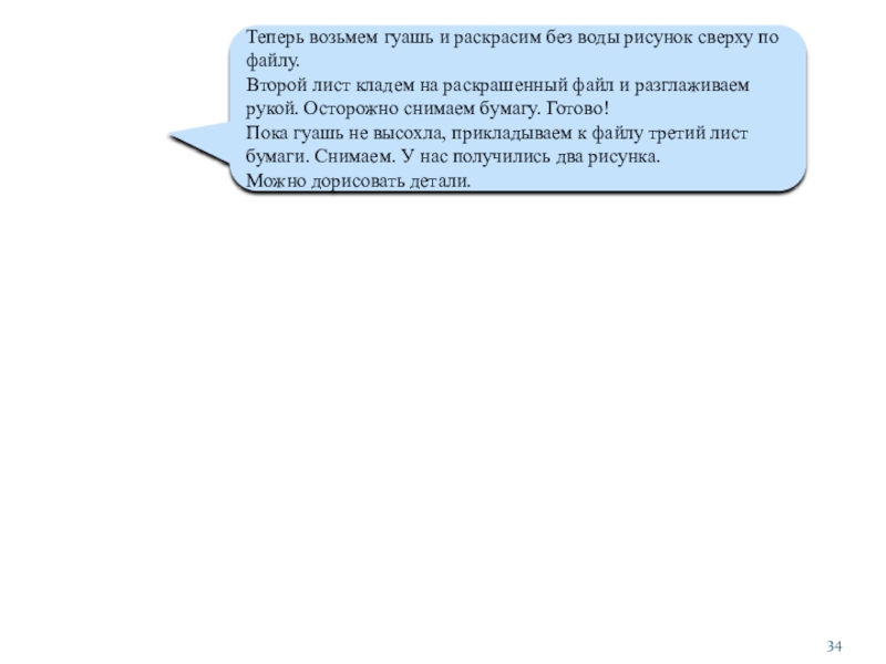 Слайд 34Теперь возьмем гуашь и раскрасим без воды рисунок сверху по файлу.