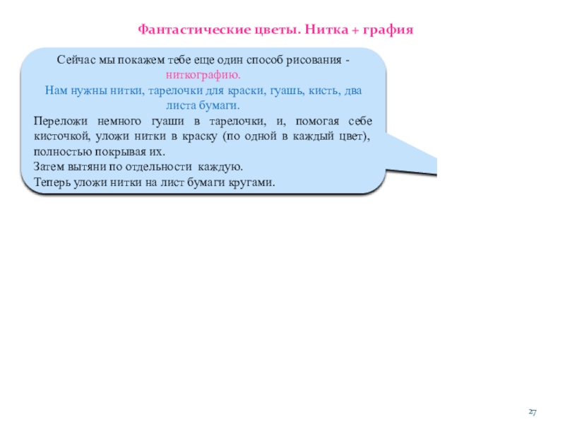 Слайд 27Сейчас мы покажем тебе еще один способ рисования - ниткографию.