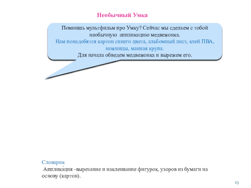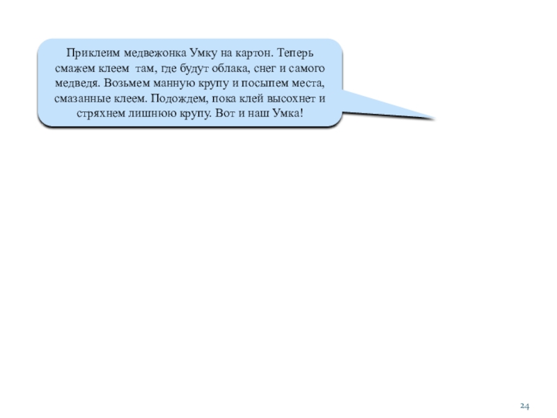Слайд 24Приклеим медвежонка Умку на картон. Теперь смажем клеем там, где будут