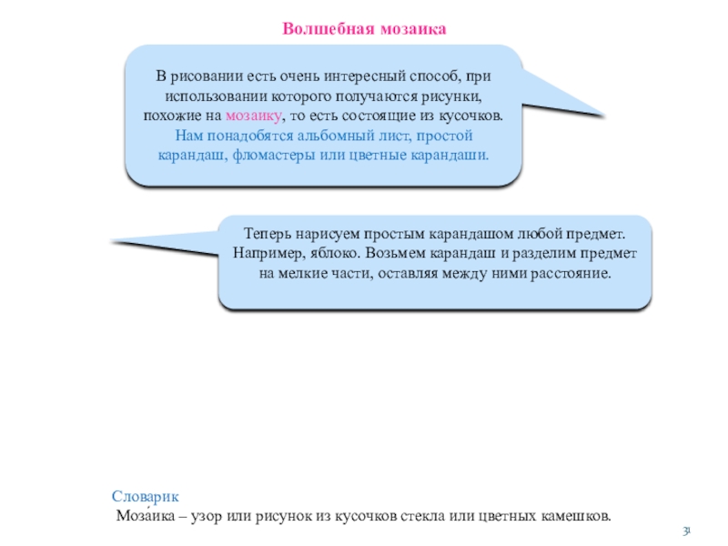 В рисовании есть очень интересный способ, при использовании которого получаются рисунки, похожие на мозаику, то есть состоящие из кусочков.