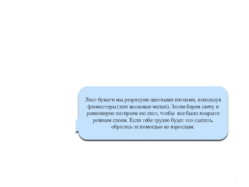Слайд 11Лист бумаги мы разрисуем цветными пятнами, используя фломастеры (или восковые мелки).