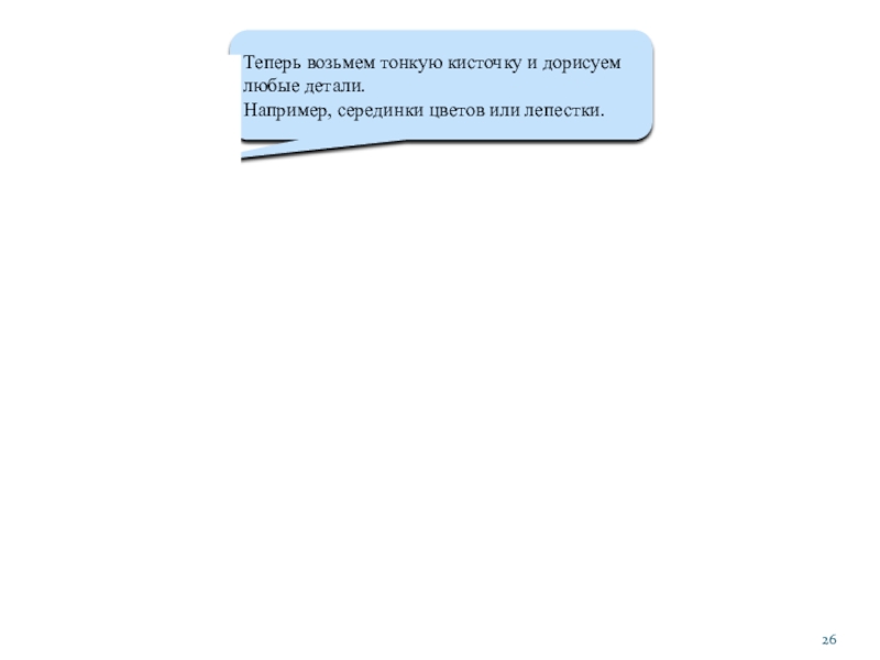 Слайд 26Теперь возьмем тонкую кисточку и дорисуем любые детали.