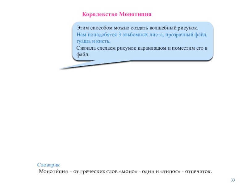 Моноти́пия – от греческих слов «моно» - один и «типос» - отпечаток.