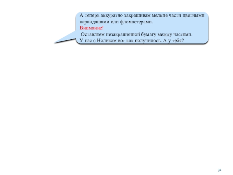 Слайд 32А теперь аккуратно закрашивам мелкие части цветными карандашами или фломастерами.