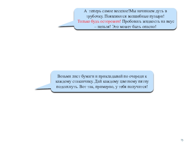 Слайд 15А теперь самое веселое!Мы начинаем дуть в трубочку. Появляются волшебные пузыри!