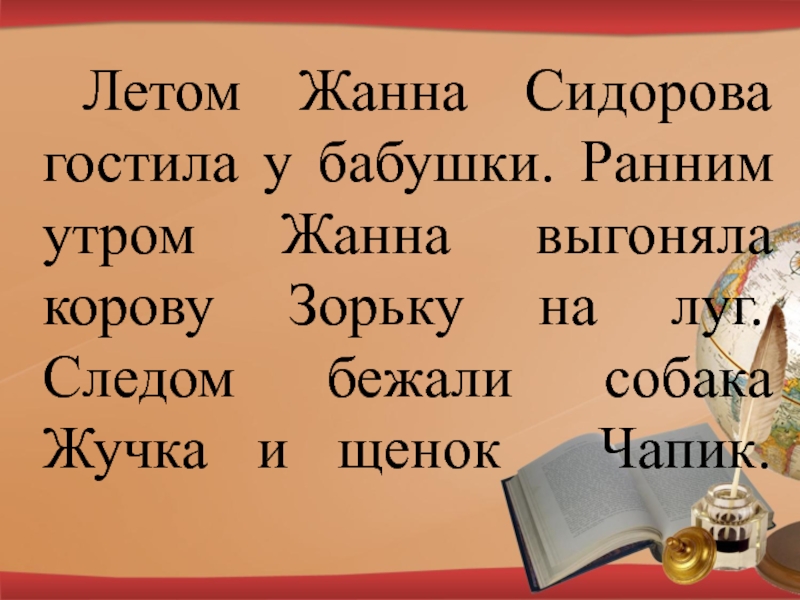 Слайд 15 Летом Жанна Сидорова гостила у бабушки. Ранним утром Жанна выгоняла корову