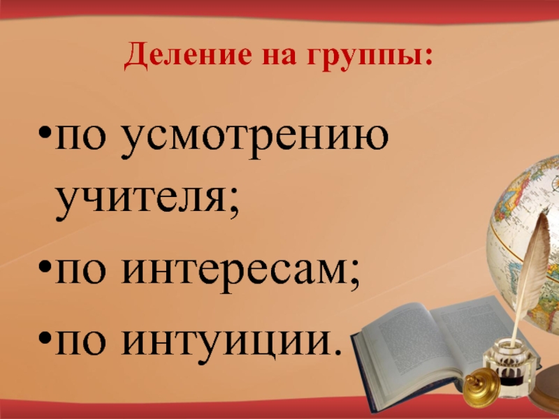 Деление на группы:по усмотрению учителя;по интересам;по интуиции.