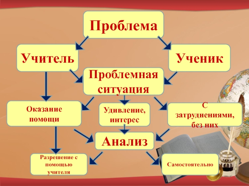 УченикУчительПроблемная ситуацияПроблемаОказание помощиУдивление, интересС затруднениями, без нихСамостоятельноРазрешение с помощью учителяАнализ