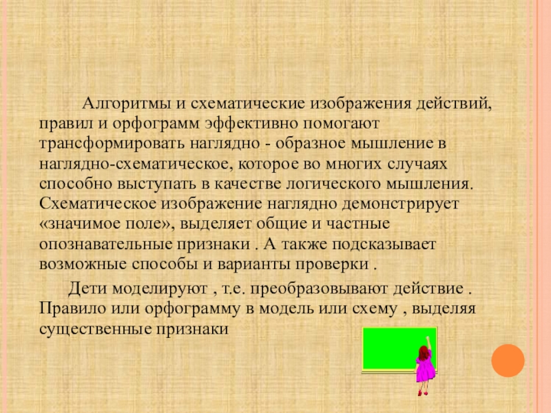 действий, правил и орфограмм эффективно помогают трансформировать наглядно - образное мышление в наглядно-схематическое, которое во многих случаях способно выступать в качестве логического мышления. Схематическое изображение наглядно демонстрирует «значимое поле», выделяет общие и частные опознавательные признаки . А также подсказывает возможные способы и варианты проверки .
