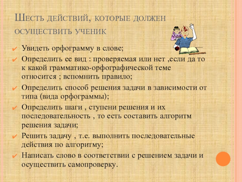 Слайд 8Шесть действий, которые должен осуществить ученик