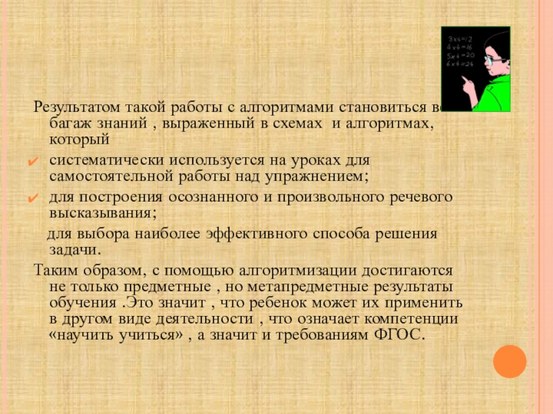 Слайд 14Результатом такой работы с алгоритмами становиться весь багаж знаний , выраженный