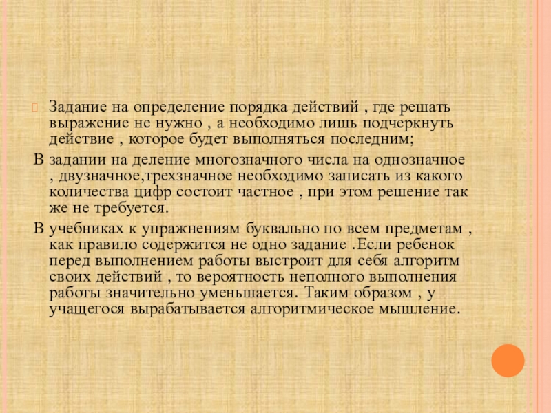 В учебниках к упражнениям буквально по всем предметам , как правило содержится не одно задание .Если ребенок перед выполнением работы выстроит для себя алгоритм своих действий , то вероятность неполного выполнения работы значительно уменьшается. Таким образом , у учащегося вырабатывается алгоритмическое мышление.