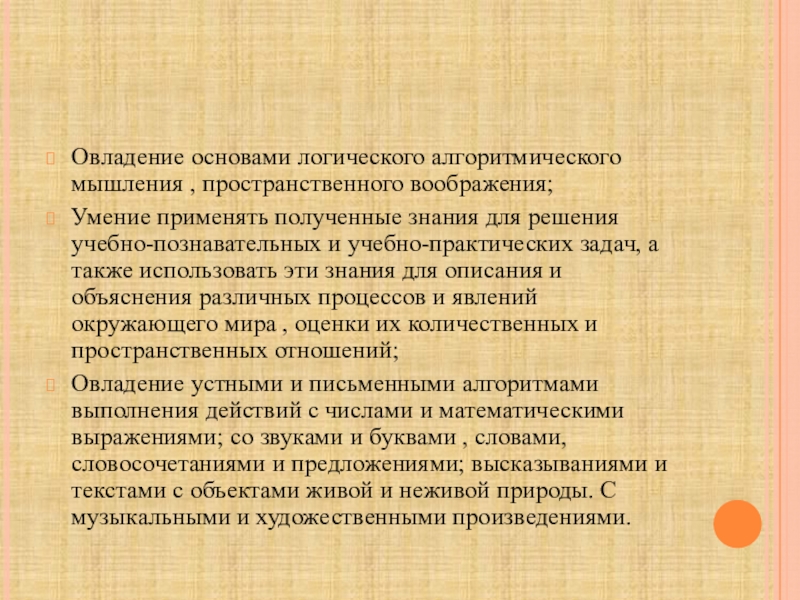 Слайд 4Овладение основами логического алгоритмического мышления , пространственного воображения;