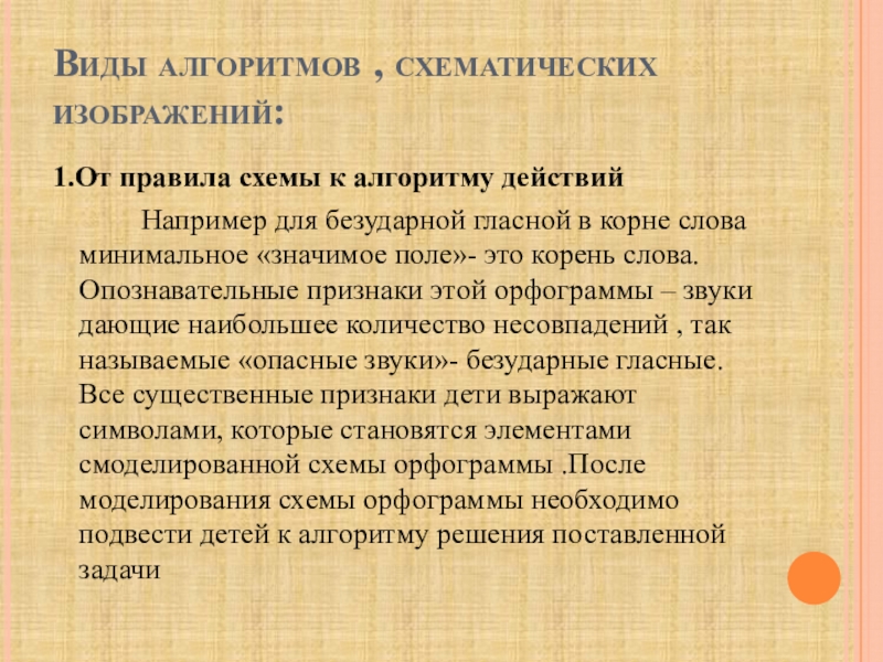 Например для безударной гласной в корне слова минимальное «значимое поле»- это корень слова. Опознавательные признаки этой орфограммы – звуки дающие наибольшее количество несовпадений , так называемые «опасные звуки»- безударные гласные. Все существенные признаки дети выражают символами, которые становятся элементами смоделированной схемы орфограммы .После моделирования схемы орфограммы необходимо подвести детей к алгоритму решения поставленной задачи