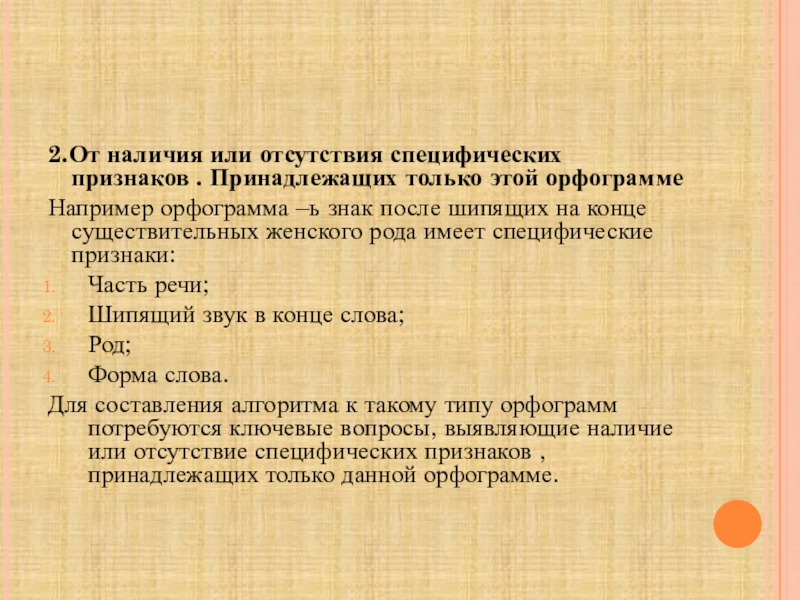 2.От наличия или отсутствия специфических признаков . Принадлежащих только этой орфограмме
