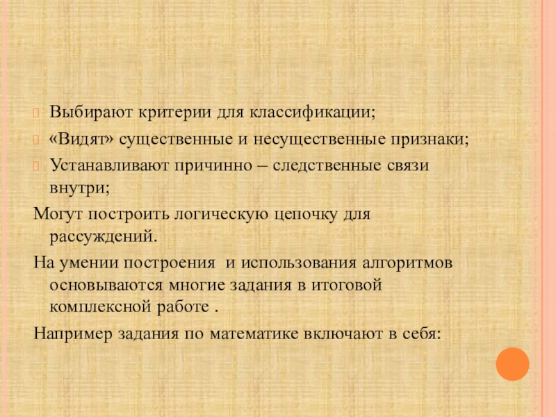 На умении построения и использования алгоритмов основываются многие задания в итоговой комплексной работе .