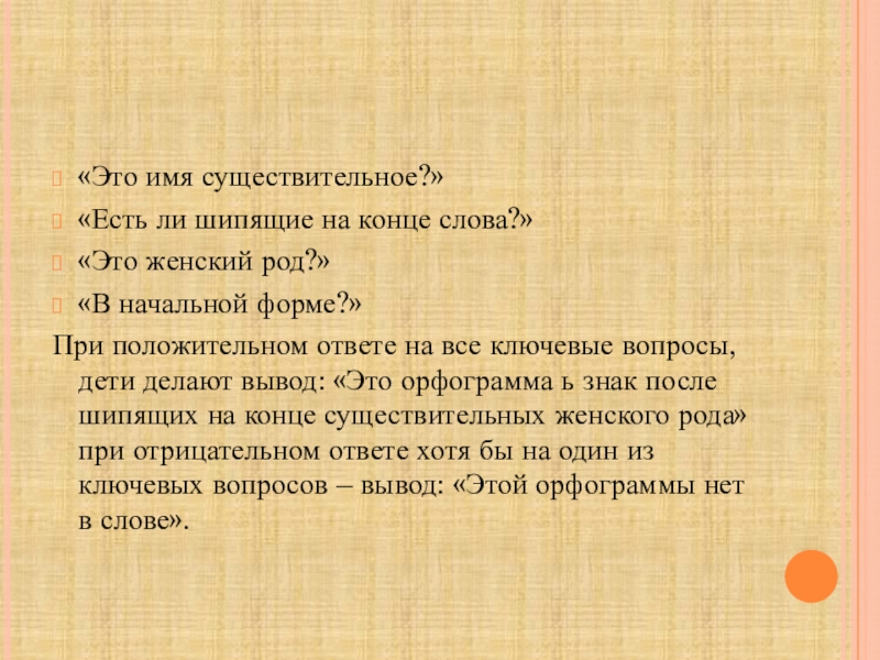 При положительном ответе на все ключевые вопросы, дети делают вывод: «Это орфограмма ь знак после шипящих на конце существительных женского рода» при отрицательном ответе хотя бы на один из ключевых вопросов – вывод: «Этой орфограммы нет в слове».