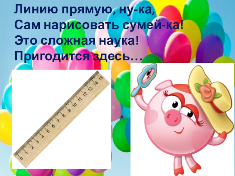 Слайд 14Линию прямую, ну-ка, Сам нарисовать сумей-ка! Это сложная наука! Пригодится здесь…