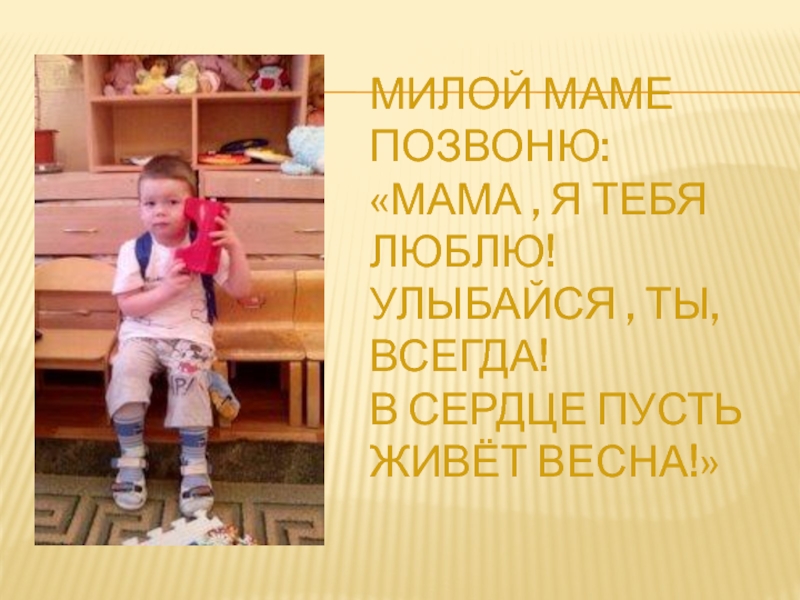 Слайд 9Милой маме позвоню: «Мама , я тебя люблю! Улыбайся , ты, всегда! В сердце