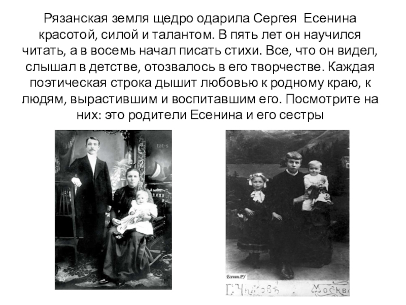 пять лет он научился читать, а в восемь начал писать стихи. Все, что он видел, слышал в детстве, отозвалось в его творчестве. Каждая поэтическая строка дышит любовью к родному краю, к людям, вырастившим и воспитавшим его. Посмотрите на них: это родители Есенина и его сестры