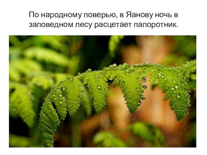 Слайд 19По народному поверью, в Яанову ночь в заповедном лесу расцетает папоротник.