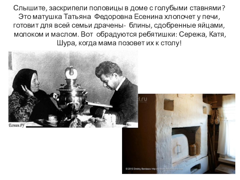 Федоровна Есенина хлопочет у печи, готовит для всей семьи драчены- блины, сдобренные яйцами, молоком и маслом. Вот обрадуются ребятишки: Сережа, Катя, Шура, когда мама позовет их к столу!