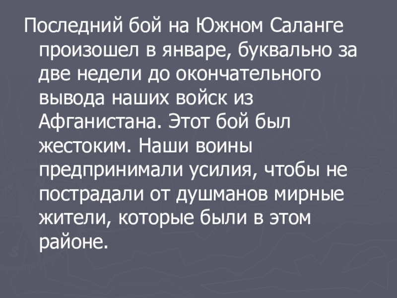 Слайд 19Последний бой на Южном Саланге произошел в январе, буквально за две
