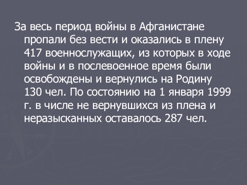 Слайд 10За весь период войны в Афганистане пропали без вести и оказались
