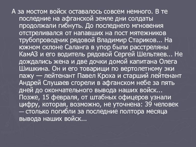 афганской земле дни солдаты продолжали гибнуть. До последнего мгновения отстреливался от напавших на пост мятежников трубопроводчик рядовой Владимир Стариков... На южном склоне Саланга в упор были расстреляны КамАЗ и его водитель рядовой Сергей Шельтяев... Не дождались жена и две дочки домой капитана Олега Шишкина. Он и его товарищи по вертолетному экипажу — лейтенант Павел Кроха и старший лейтенант Андрей Слушаев сгорели в афганском небе за пять дней до окончательного вывода наших войск... Позже, 15 февраля, от штабных офицеров узнали цифру, которая, возможно, не уточнена: 39 человек — столько погибли за последние полтора месяца вывода наших войск...