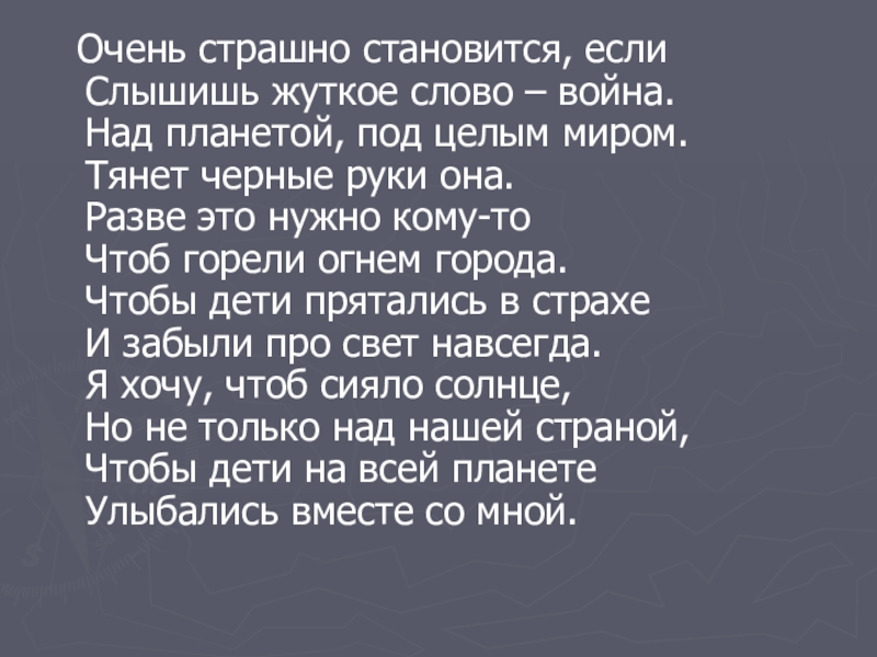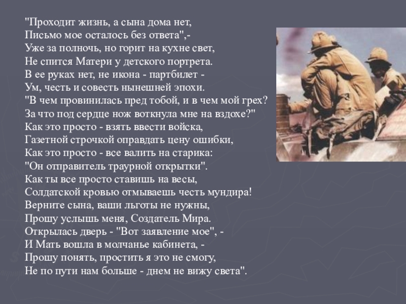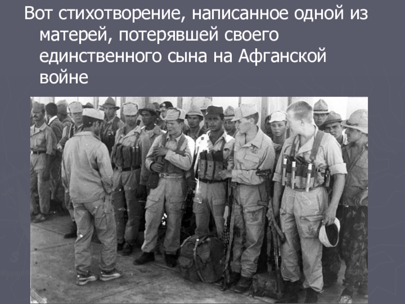 Слайд 12Вот стихотворение, написанное одной из матерей, потерявшей своего единственного сына на