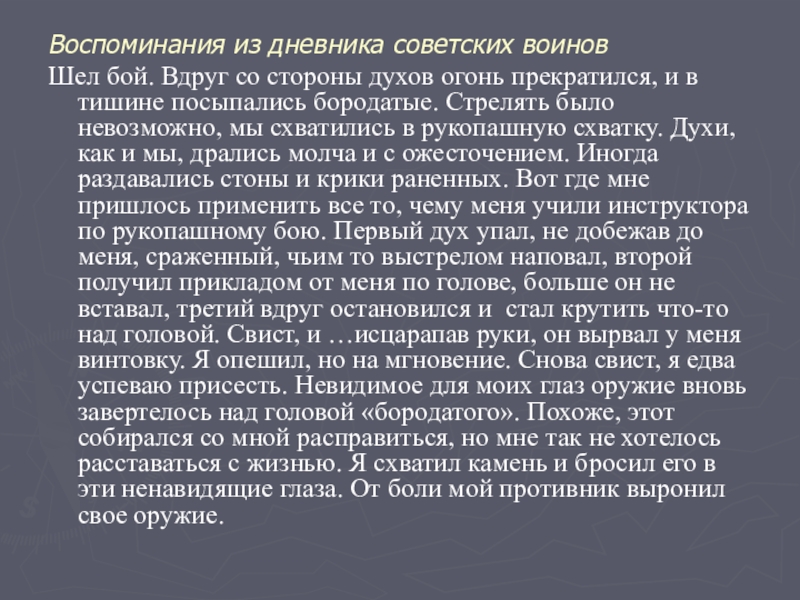 прекратился, и в тишине посыпались бородатые. Стрелять было невозможно, мы схватились в рукопашную схватку. Духи, как и мы, дрались молча и с ожесточением. Иногда раздавались стоны и крики раненных. Вот где мне пришлось применить все то, чему меня учили инструктора по рукопашному бою. Первый дух упал, не добежав до меня, сраженный, чьим то выстрелом наповал, второй получил прикладом от меня по голове, больше он не вставал, третий вдруг остановился и стал крутить что-то над головой. Свист, и …исцарапав руки, он вырвал у меня винтовку. Я опешил, но на мгновение. Снова свист, я едва успеваю присесть. Невидимое для моих глаз оружие вновь завертелось над головой «бородатого». Похоже, этот собирался со мной расправиться, но мне так не хотелось расставаться с жизнью. Я схватил камень и бросил его в эти ненавидящие глаза. От боли мой противник выронил свое оружие.