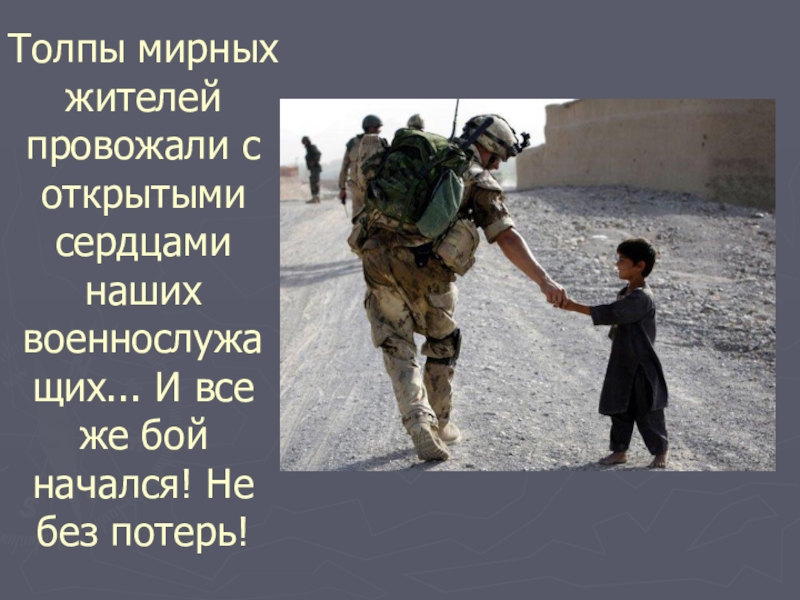Слайд 20Толпы мирных жителей провожали с открытыми сердцами наших военнослужащих... И все