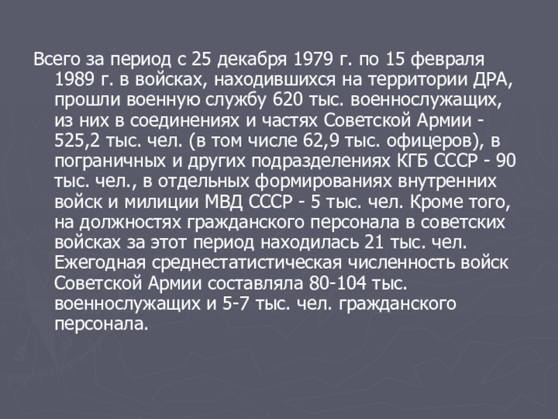 1989 г. в войсках, находившихся на территории ДРА, прошли военную службу 620 тыс. военнослужащих, из них в соединениях и частях Советской Армии - 525,2 тыс. чел. (в том числе 62,9 тыс. офицеров), в пограничных и других подразделениях КГБ СССР - 90 тыс. чел., в отдельных формированиях внутренних войск и милиции МВД СССР - 5 тыс. чел. Кроме того, на должностях гражданского персонала в советских войсках за этот период находилась 21 тыс. чел. Ежегодная среднестатистическая численность войск Советской Армии составляла 80-104 тыс. военнослужащих и 5-7 тыс. чел. гражданского персонала.