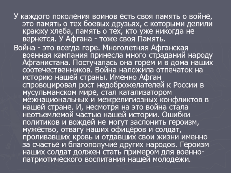 Война - это всегда горе. Многолетняя Афганская военная кампания принесла много страданий народу Афганистана. Постучалась она горем и в дома наших соотечественников. Война наложила отпечаток на историю нашей страны. Именно Афган спровоцировал рост недоброжелателей к России в мусульманском мире, стал катализатором межнациональных и межрелигиозных конфликтов в нашей стране. И, несмотря на это война стала неотъемлемой частью нашей истории. Ошибки политиков и вождей не могут заслонить героизм, мужество, отвагу наших офицеров и солдат, проливавших кровь и отдавших свои жизни именно за счастье и благополучие других народов. Героизм наших солдат должен стать примером для военно-патриотического воспитания нашей молодежи.