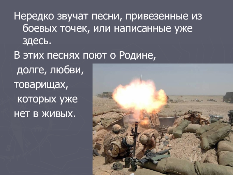 Слайд 11Нередко звучат песни, привезенные из боевых точек, или написанные уже здесь.