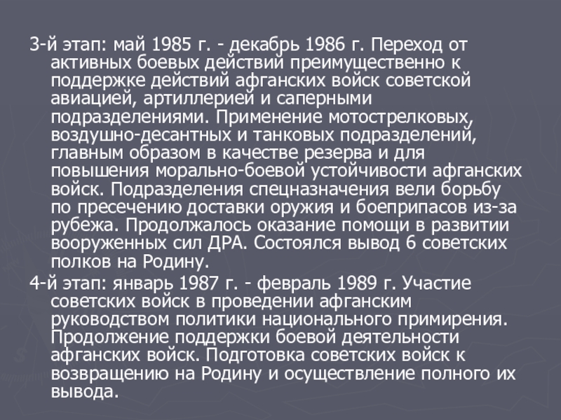 4-й этап: январь 1987 г. - февраль 1989 г. Участие советских войск в проведении афганским руководством политики национального примирения. Продолжение поддержки боевой деятельности афганских войск. Подготовка советских войск к возвращению на Родину и осуществление полного их вывода.