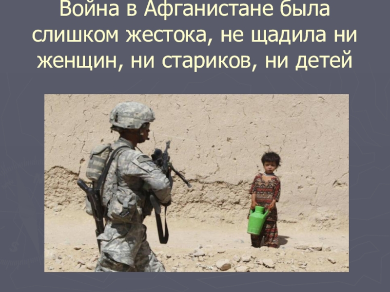 Слайд 14Война в Афганистане была слишком жестока, не щадила ни женщин, ни