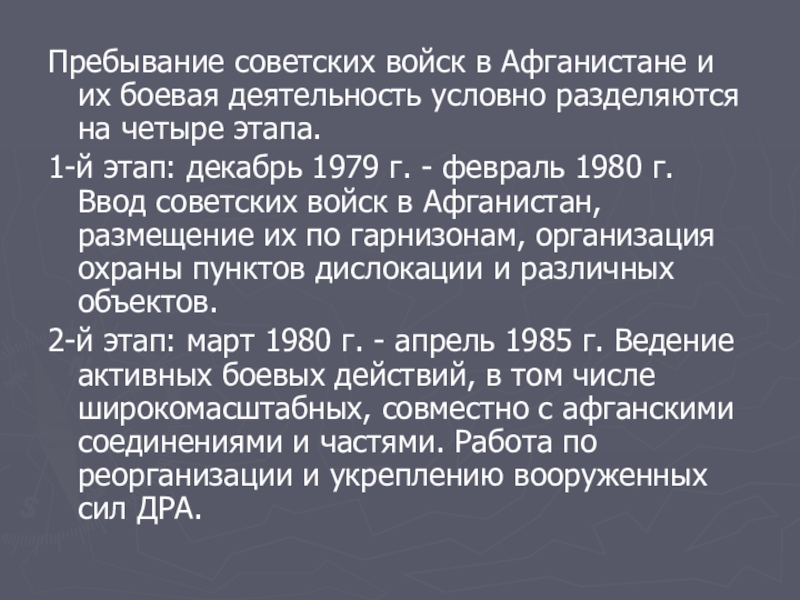 Слайд 6Пребывание советских войск в Афганистане и их боевая деятельность условно разделяются
