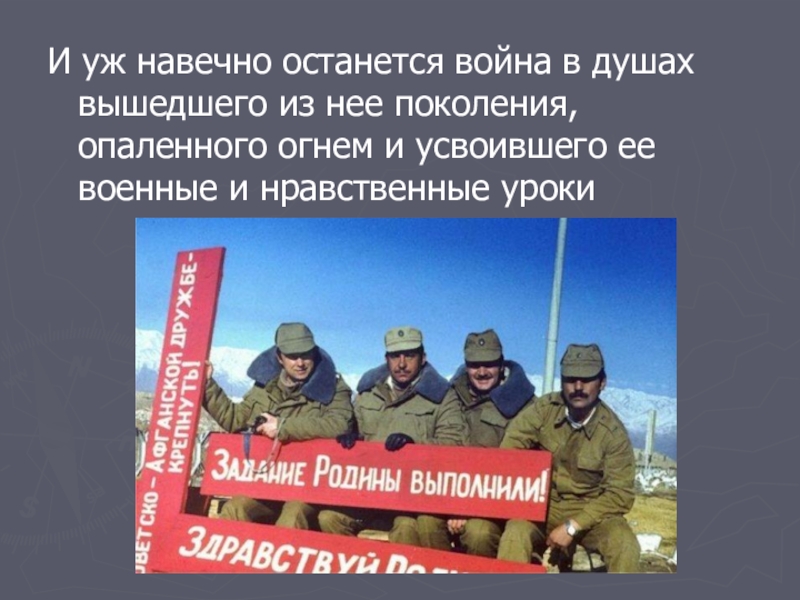 Слайд 23И уж навечно останется война в душах вышедшего из нее поколения,