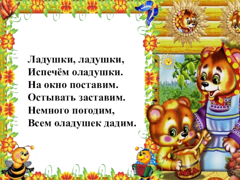 Ладушки, ладушки, Испечём оладушки. На окно поставим.Остывать заставим. Немного погодим,Всем оладушек дадим.