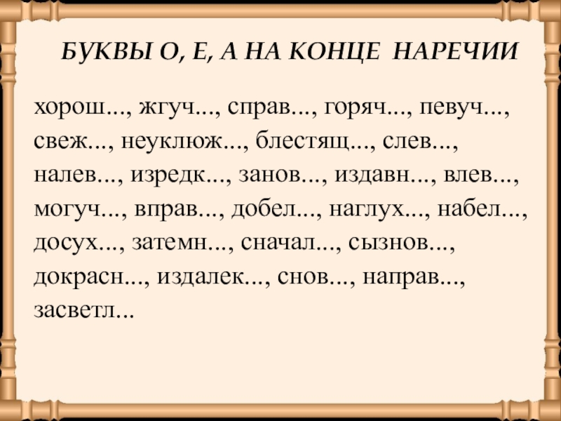Слайд 11БУКВЫ О, Е, А НА КОНЦЕ НАРЕЧИИ
