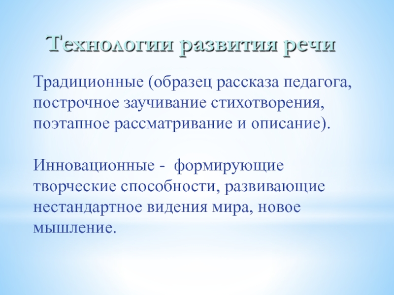 Слайд 9Традиционные (образец рассказа педагога, построчное заучивание стихотворения, поэтапное рассматривание и описание).