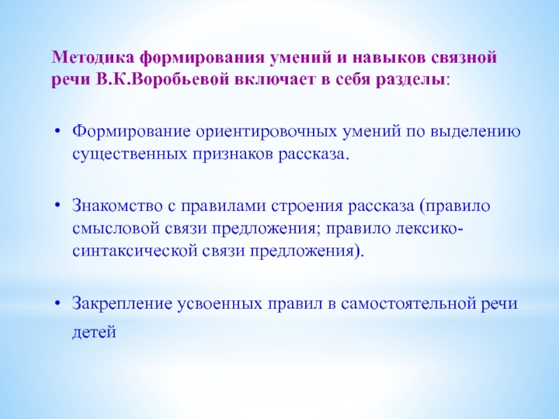 Слайд 15Методика формирования умений и навыков связной речи В.К.Воробьевой включает в себя