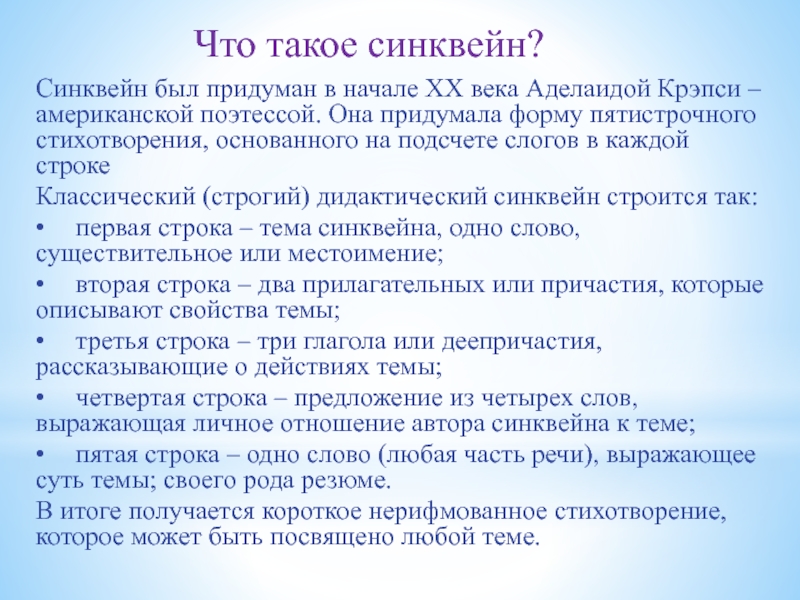 Синквейн был придуман в начале XX века Аделаидой Крэпси